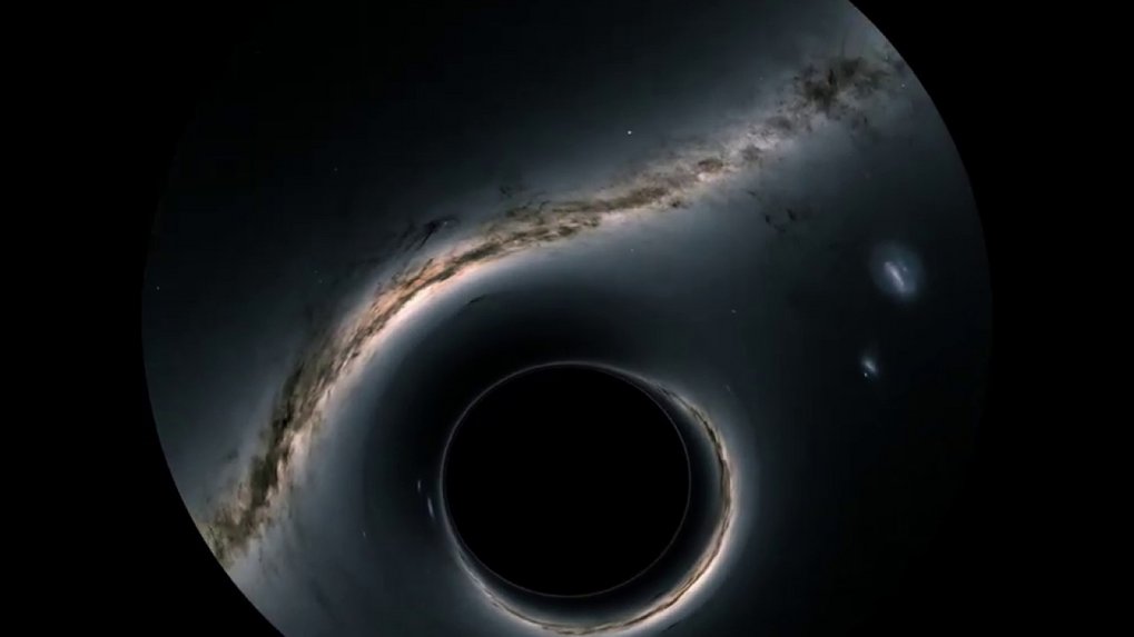 What if we could observe not the effect of our Sun, but that of a black hole? In that case, the distortion would be much larger. This is what a black hole would look like as it moves between us and the Milky Way. As you can see, some of the Milky Way's light has travelled around the black hole, and is now reaching us from the opposite side – a phantom image! |