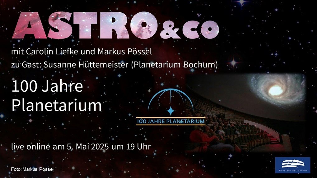 Anlässlich dieses Jubiläums bietet das Haus der Astronomie gleich drei Veranstaltungen an: Am Montag, dem 5. Mai 2025, haben Carolin Liefke und Markus Pössel dazu Susanne Hüttemeister vom Planetarium Bochum live in unserer Online-Gesprächsrunde Astro & Co zu Gast. Deren Aufzeichnung kann anschließend auch nachträglich angesehen werden.