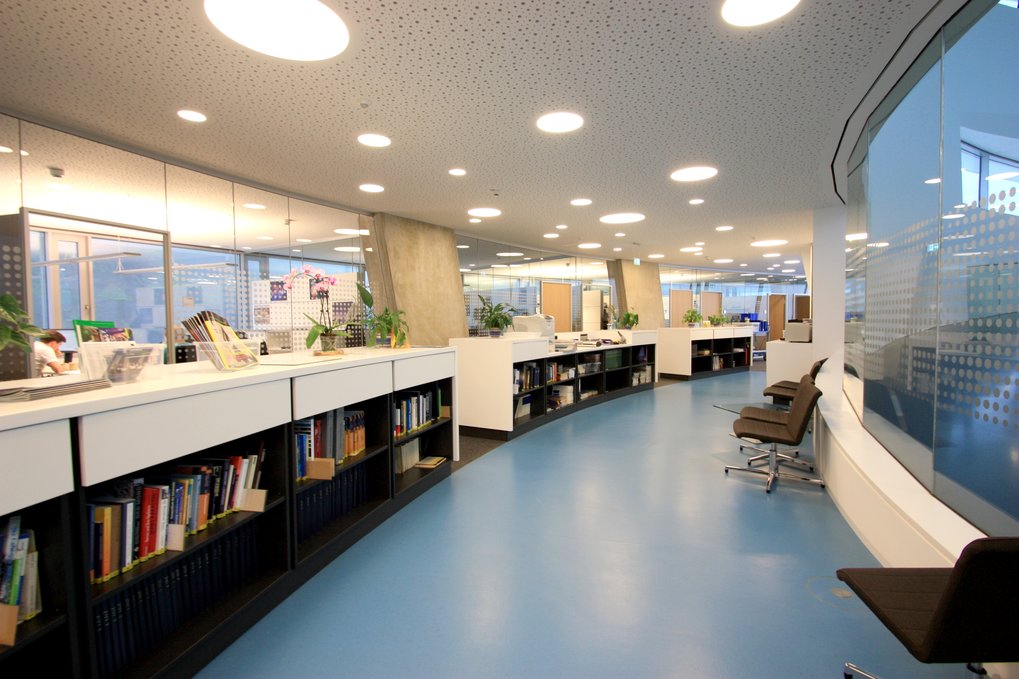 Innenansicht des HdA-Gebäudes: Blick in die Teamzone im Büroflügel des Hauses der Astronomie. Vorne der Tresen mit der Handbibliothek.