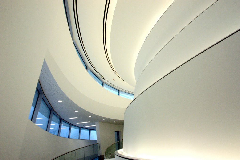 Innenansicht des HdA-Gebäudes: Blick in den Zentralbereich. Rechts die Verkleidung der Kuppel des Klaus Tschira-Auditoriums.
