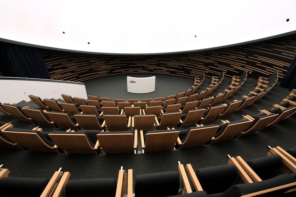 Innenansicht des HdA-Gebäudes: Blick ins Klaus Tschira-Auditorium (zentraler Hörsaal im HdA mit digitaler Planetariums-Projektionsanlage; 100 Sitzplätze).