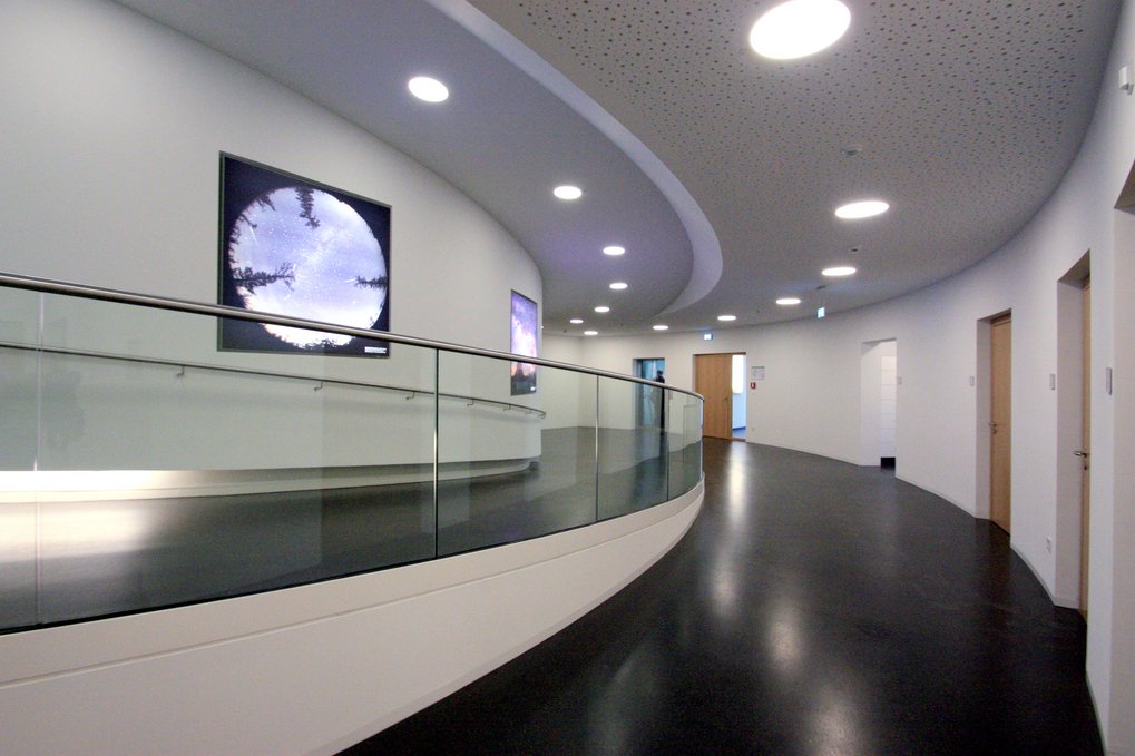 Innenansicht des HdA-Gebäudes: Ausstellungsbereich im Foyer: Leuchtkästen mit Bildern zur Astronomie bei verschiedenen Wellenlängen; mittig: Modelle der Teleskope des Calar Alto-Observatoriums im Maßstab 1:50.