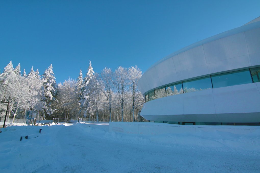 Winterimpressionen: Blick von Westen auf das HdA-Gebäude und den dahinterliegenden Wald auf dem Königstuhl in Heidelberg im Dezember 2012.